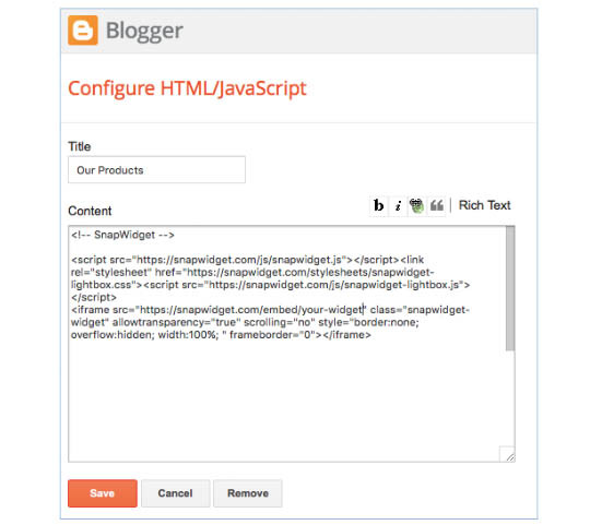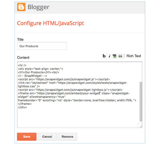 (Note: Any changes you make to the snippet contents will be only applicable to this Blogger instance, anywhere else you display your widget will be as you have set up your widget on your SnapWidget dashboard.)