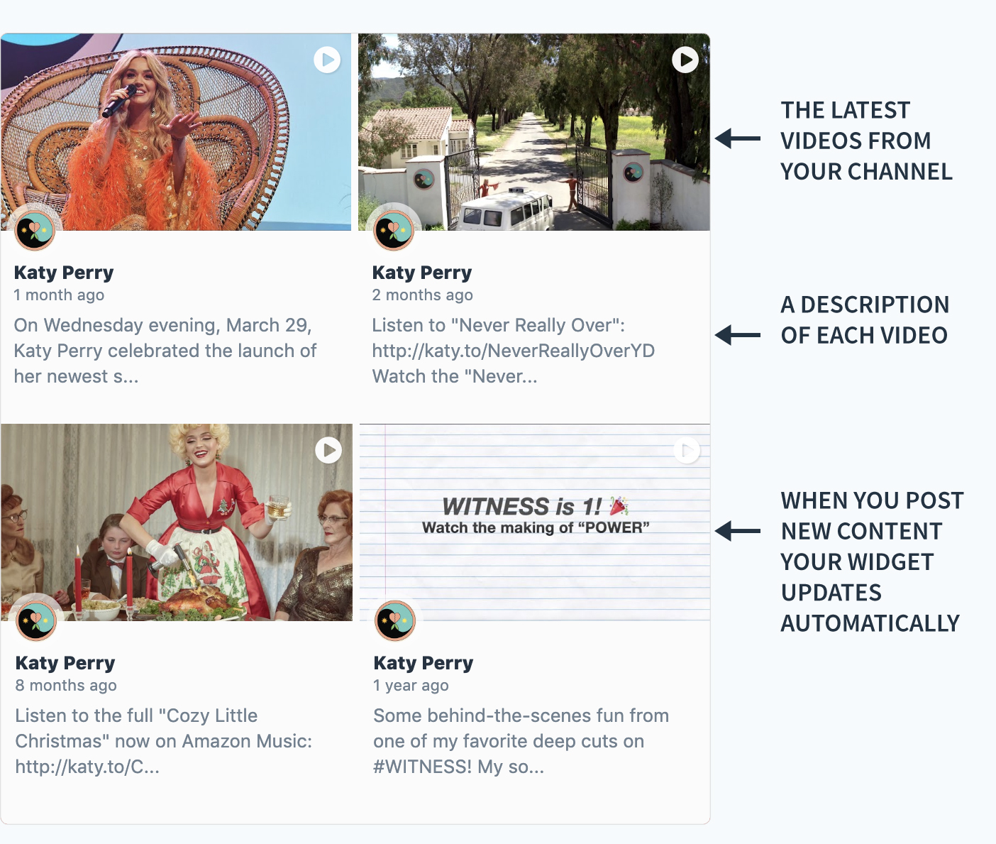 Your latest videos from your YouTube account will always be displayed in the widget.